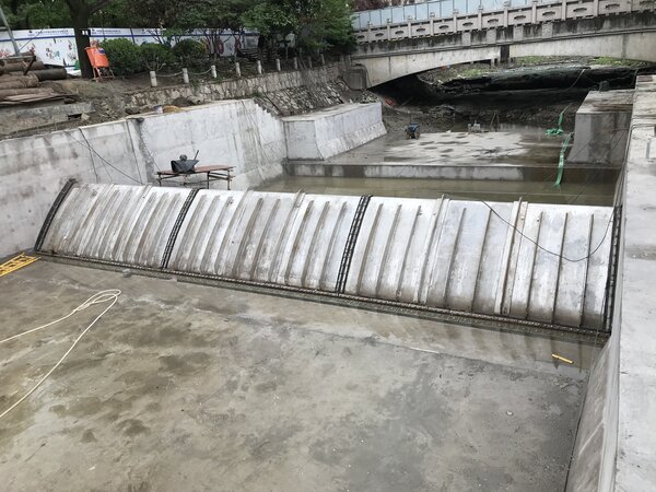 气动盾形闸门系统是利用空气压缩原理,通过气袋充气与排气,使钢闸门升起与倒伏,以维持特定的水位高度。允许闸顶溢流。闸门全开时,门体全部倒卧在河底,可高效泄水,不影响景观和通航。闸门全关闭时,可以蓄水,超过设定水位时,可形成溢流景观。